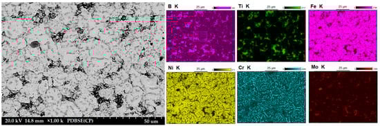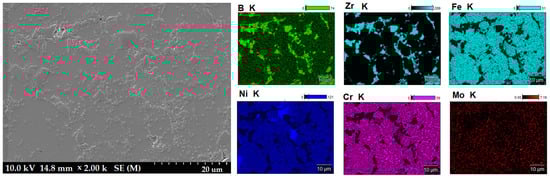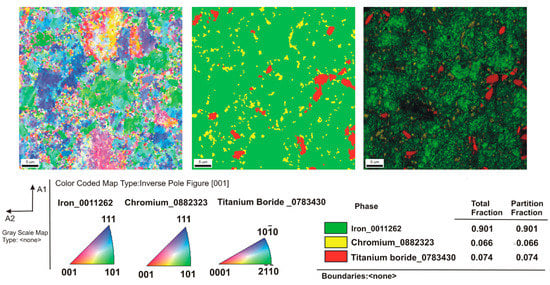 Figure 3 shows the microstructure of the composites as a function of the type of reinforcement and its weight fraction. Comparing the microstructures, it was found that borides tended to be located along the grain boundaries of the steel matrix. The distribution of the reinforcing phase was basically even for the steel + ZrB2 and steel + TiB2 composites. Only in the case of composites containing 10 wt% ZrB2 (Figure 3d), the formation of agglomerations of the ceramic phase was observed locally, which may be the result of insufficient preparation of the composite powder mixture at the mixing stage in Turbula. In the WDS examinations of the chemical composition of the steel+ZrB2 and steel+TiB2 composites (Figure 4 and Figure 5), the presence of very fine chromium-containing precipitates was detected. The results of the EBSD analysis are compared in Figure 6 and Figure 7, respectively. The phase analysis of the steel+ZrB2 composites showed the presence of the following phases in the microstructure: Fe, ZrB2, and a chromium-containing phase. In turn, for the steel+TiB2 composites, the following phases were detected in the microstructure: Fe, TiB2, and a chromium-containing phase.
