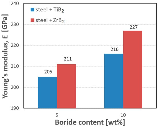 In Figure 8 and Table 1, the results of Young’s modulus tests are given. The analysis of the data showed that the Young’s modulus increased with the increasing content of the reinforcing phase. The highest values were obtained for composites containing 10 wt% of the reinforcing phase. It was observed that the addition of ZrB2 to the steel matrix gave higher values of the Young’s modulus than the addition of TiB2. For composites reinforced with 5% and 10% TiB2, the values of the Young’s modulus were 205 GPa and 216 GPa, respectively, while 5% and 10% ZrB2 added to the steel matrix produced the Young’s modulus values of 211 GPa and 227 GPa, respectively. For comparison, the Young’s modulus of sintered 316L steel was 198 GPa.