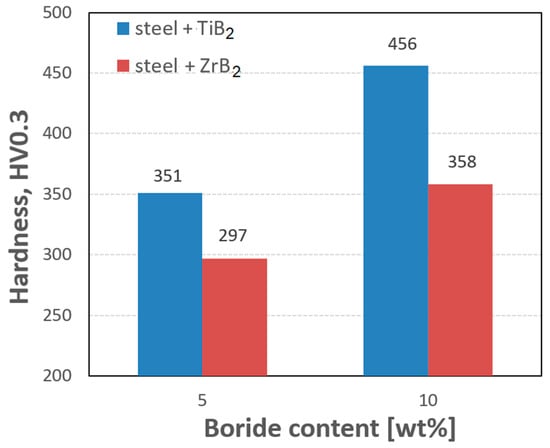 The important factors that determine the achievement of the optimum properties of composite materials include the choice of the proper reinforcing phase (material, content, and shape of precipitates), as well as the choice of the proper sintering process, parameters of the microstructure, and properties of sintered products (diffusion coefficient, viscosity, crystallographic structure, and presence of oxides) [11,12]. The use of TiB2 and ZrB2 ceramics is limited for technological reasons. Because of the high melting point, strong covalent bond, and low self-diffusion coefficient, it is difficult to obtain pure and compact boride ceramics using conventional sintering methods [13,14,15]. However, owing to their excellent properties, borides are preferred as the reinforcing phase of metal matrix composites. Borides such as ZrB2 and TiB2 are a special type of materials characterized by a high melting point (>3273 K), high hardness (ZrB2: ∼22–25 GPa, TiB2: ∼25–30 GPa) and Young’s modulus (ZrB2: 440–460 GPa, TiB2: 510–575 GPa), very high wear resistance, high oxidation and heat resistance, and satisfactory electrical properties [16,17,18]. Therefore, ZrB2 or TiB2 are increasingly used to reinforce steel matrix composites [19,20,21,22], aluminum alloys [23,24], copper alloys [25,26], and intermetallic phases [27].
