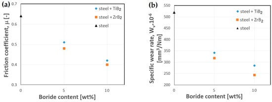 The wear resistance of the composites was assessed by measurements of the coefficient of friction and the determination of the specific wear rate in a ball-on-disc test. Figure 11 shows the effect of the content of two ceramic additives on the tribological properties of composites. From the obtained results, it follows that the coefficient of friction and the specific wear rate depend on the amount, as well as the type of boride phase. The coefficient of friction and the specific wear rate decrease with the reinforcing phase content increasing in the steel matrix. The additions of ZrB2 and TiB2 improved the wear resistance of austenitic stainless steel, owing to the high hardness of the ceramic particles [17,18], which hinders the wear of the reinforcement and, at the same time, protects the steel matrix from intensive wear. Moreover, the results have shown that the use of ZrB2 allowed for obtaining better tribological properties. Regardless of the content of the reinforcing phase, the coefficient of friction and the specific wear rate were always lower when ZrB2 was used.