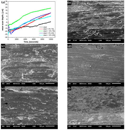 (a) Depth of scar as a function of the test duration and SEM micrograph of the worn surface of: (b) steel and composites with (c) 5% ZrB2, (d) 10% ZrB2, (e) 5% TiB2, and (f) 10% TiB2.