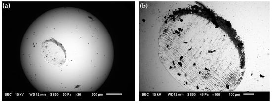 (a,b) SEM micrograph of the wear surface of the Al2O3 ball after the tribological test.