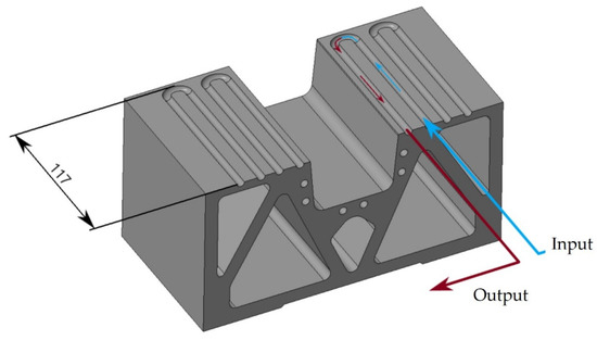 A combined hot stamping tool was used for the experiment. Figure 2 shows the CAD model of the tool. The heated part has holes for HPCH (i.e., high power cartridge heater) stainless steel heating cartridges with a diameter of 20 mm and a length of 125 mm, capable of reaching temperatures of up to 750 °C. The upper part has three cartridges and the lower has four cartridges. All the cartridges are connected to a heating source with PID controllers. Figure 3 shows the detail of the cooled part of the tool with the cut view of the cooling channels inside. The tool was printed from MS1 material on the EOS M290 3D printer which works on the principle of DMLS (direct metal laser sintering). The models underwent topological optimization to save material. Heat treatment in a protective argon atmosphere was carried out after printing to reduce internal stresses. It consisted of heating to 820 °C with a dwell time of one hour and aging at 490 °C for six hours [19]. Hoses with threaded brass hose tails were connected to the cooled part. The cooling medium was water which flowed through distribution blocks made of aluminium alloy, one with 14 inputs of water and the other with 14 outputs. Between the heated and cooled parts there were insulating plates made of laminate material PAMITHERM 41,130 with a thickness of 5 mm.