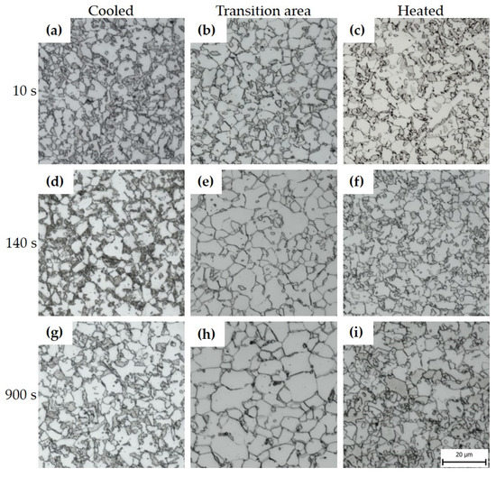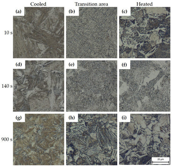 Table 3 shows the HV10 hardness values with standard deviation. In 22MnB5 there was a decrease in hardness from the cooled part to the heated part. At 10 s dwell, 469 ± 7 HV10 was achieved in the cooled part, 254 ± 2 HV10 in the transition area, and 216 ± 4 HV10 in the heated part.