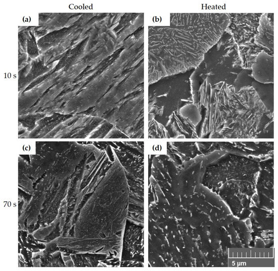For a more detailed analysis, the microstructures were also documented on a Tescan VEGA 3 scanning electron microscope (Figure 7). For the SEM images of 22MnB5 steel, only samples with tool dwell times of 10 and 70 s were selected because these times should be sufficient to achieve martensite in the structure. It is clear from the microstructure images that at a tool dwell time of 10 s in the cooled part, the structure was predominantly martensite, while at the same time, significant precipitation of very fine particles can be seen following the martensitic needles (Figure 7a). The presence of lamellar pearlite was confirmed in the heated part (Figure 7b). During processing with a tool dwell time of 70 s, a martensitic structure was observed in the cooled part of the tool with a proportion of lower bainite and precipitations along the boundaries and within the martensitic and bainitic formations (Figure 7c). In the heated part, rather coarser lower-bainite blocks were observed with significant precipitation along the bainitic ferrite laths, occasional ferritic grains, and rather rare small pearlitic islands (Figure 7d).