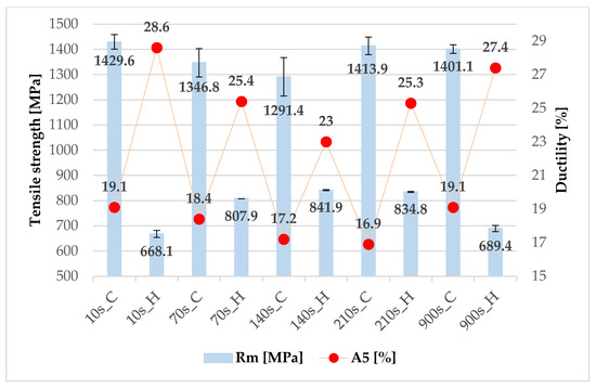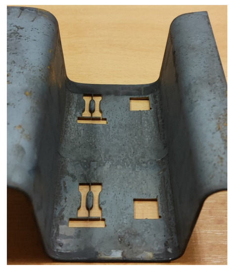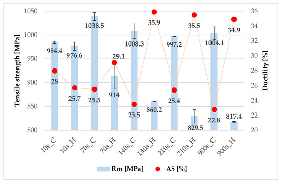 Two samples per area were also taken from the cooled and heated areas of the omega profiles for mini tensile tests, shown in Figure 8. The resulting values are shown in Figure 9. We can observe a trend of high ultimate tensile strength (Rm) for the cooled section with a lower ductility value (A5). On the other hand, for the heated part, the ductility is higher and the ultimate tensile strength is lower. The measured values of Rm are consistent with the findings of other papers, however, the values of ductility are noticeably higher. This is due to the size of the specimens used for the tensile test. A similar issue of affected ductility in terms of geometry was reported by Jirková et al. [22] and Opatová et al. [23]. The results are then only comparable mainly between each other, or with specimens with a similar length for the active part.