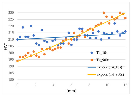 Since a change in mechanical properties was expected in the transition area, i.e., at the point of insulation between the cooled and heated part of the tool, the hardness profile over this area was measured for the 20MnAl material. The aim was to determine over how wide a region the change in properties occurs and whether there is a local step change that could cause problems. This hardness profile HV1 was measured over a total length of 12 mm with an indentation spacing of 0.3 mm. As can be seen in Figure 13, measured values were interleaved with exponential trend lines. The hardness results confirmed that for a 10 s sample there is almost no change in hardness across the region examined. For the 900 s sample, there was a gradual increase in hardness. The difference in hardness at the endpoints was approximately 30 HV1. There were no step changes in hardness in the material, which is especially important from the point of view of the use of the parts in terms of their behaviour under stress.
