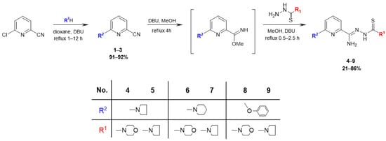 The synthesis route used in this study is outlined in Figure 2. The initial compound 6-chloropicolinonitrile was refluxed for 1–12 h with a nucleophilic agent (pyrrolidine, piperidine, phenol) and then DBU was added to dioxane, yielding 6-substituted picolinonitriles 1–3 (yield 91–92%). Subsequently, the nitrile groups were converted into methyl imidate groups. These reactions were carried out at reflux for 4 h in the presence of methanol and a catalytic amount of DBU. To obtain final products 4–9 (yield 21–86%), each of the methyliminoesters, which were in the solution form prepared in situ, was condensed with morpholine-4-carbothiohydrazide and pyrrolidine-1-carbothiohydrazide by heating at boiling temperature for 0.5–2.5 h. Carbothiohydrazides were obtained in the reaction between methyl hydrazinecarbodithioate and cyclic amines in water or alcohol, following the modified method described by Klayman et al. []. All the newly synthesized compounds were characterized using the following methods: IR, 1H NMR, and 13C NMR spectra, elemental analysis. The results of the spectral analysis were in accordance with the assigned structures. The 1H NMR and 13C NMR spectra of all compounds are provided in Supplementary Materials in Figures S1–S18.