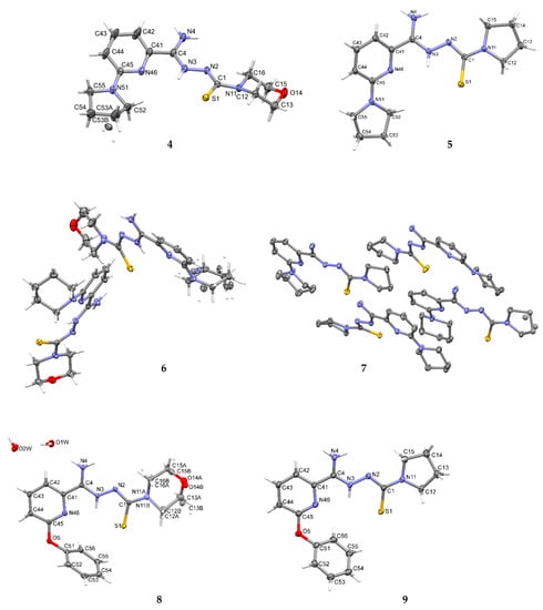 The molecular structures of compounds 4–9 showing the atom-labeling schemes. Displacement ellipsoids are drawn at the 50% probability level, and H atoms are shown as small spheres of arbitrary radii. Drawings were prepared with Mercury software.