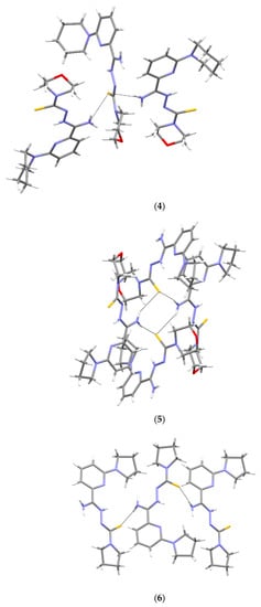 In 5, the highest maximum in the difference Fourier map was ~0.6 e/A-3, which is twice as large as the deepest hole on the map. This maximum was located near the sulfur atom, and its presence can probably be attributable to the anharmonicity of the motion of the sulfur atom since the anharmonic refinement in olex2 [] reduces this maximum to 0.3 e/A-3. Similarly, for 7, the highest maximum on the differential electron density map was twice as large as the deepest hole on the map. This disproportion can be reduced by the anharmonic refinement of sulfur atoms. In 8, a disorder of the morpholine ring was detected, which was divided into two parts with the occupancy factors 0.59 and 0.41 and refined isotropically. In 6, a large disorder was detected in the piperidine ring of molecule B. The ring was divided into two parts and refined with occupancy factors 0.83 and 0.17. Unfortunately, an additional disorder of water molecules near the threefold axis was much more difficult to refine; therefore, the SQUEEZE procedure was used. The number of electrons found in the solvent-accessible volume was 20, which gave two water molecules in the unit cell. In 4, a significant disorder around the threefold axis was detected; therefore, the SQUEEZE procedure was used again. The number of electrons found in the solvent-accessible volume was 112, which can be interpreted as three isopropanol molecules and one water molecule in a unit cell. CCDC 2216086, 2216085, 2216084, 2216082, 2208427, and 2,208,428 contain the supplementary crystallographic data for this study. The data were provided free of charge by The Cambridge Crystallographic Data Centre via www.ccdc.cam.ac.uk/structures (accessed on 31 October 2022).