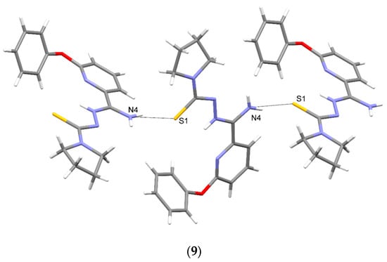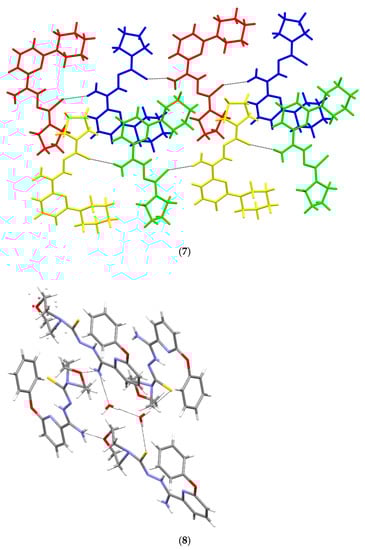 Crystallographic data are presented in Table 4 and Table 5. All tested compounds in the crystal state assumed the zwitterionic form (Figure 3). Four of the structures, namely 4, 6–8, showed static disorder. For trigonal structures, namely compounds 4 and 6, the disorder was so significant that the SQUEEZE procedure had to be applied. Three structures, namely 4, 6, and 8, were solvates, but the positions of the water molecules were well-defined only in compound 8. Strong hydrogen bonds occurring in the studied compounds are presented in Table 6, Table 7, Table 8, Table 9, Table 10 and Table 11 and in Figure 4. Compounds 5, 7, and 9 showed the same hydrogen bond system. A chain hydrogen bond of the N–H···S type was formed (Figure 4, example for 9). A chain bifurcated hydrogen bond of the N–H···S···H–N type was formed in compound 6 (Figure 4). The most complex system of hydrogen bonds was observed in compound 8, in which water molecules formed hydrogen bonds with each other and with the NH2 group and the sulfur atom (Figure 4). Four molecules in the asymmetric unit were identified in compound 7. Due to hydrogen bonding, molecules A and B and molecules C and D formed chains along the [110] crystallographic direction. These chains, in turn, established planes parallel to the plane in the crystal.