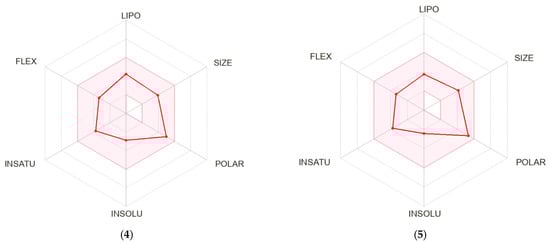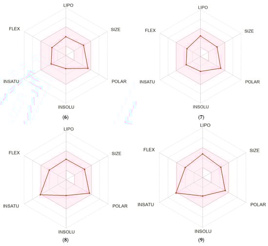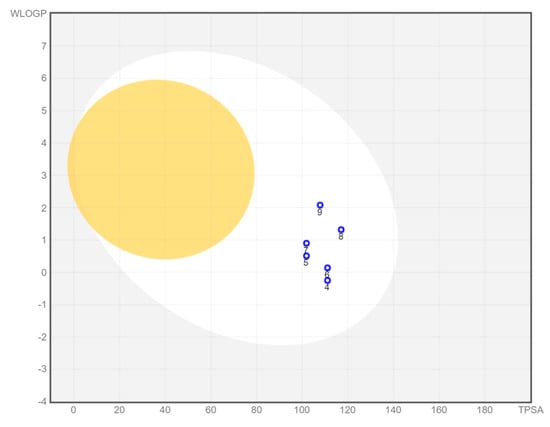 A bioavailability radar was created for each compound studied (Figure 5). With respect to drug-likeness, the compounds were found to have a good bioavailability score (0.55). All compounds were found to conform to the rules of Lipinski [], Ghose [], Egan [], Veber [], and Muegge []. Thus, all compounds are good drug candidates. The logKp value for the tested compounds ranged from −7.61 cm/s to −6.39 cm/s, and the more negative the logKp, the less skin-permeant the molecule. In the BOILED-Egg diagram (Figure 6), all compounds showed absorption in the gastrointestinal tract, which may make them effective drugs. None of the compounds permeated the blood–brain barrier. All compounds were actively effluxed by P-glycoprotein, represented as (PGP+), which is indicated by the blue color of the indicator of the compound.
