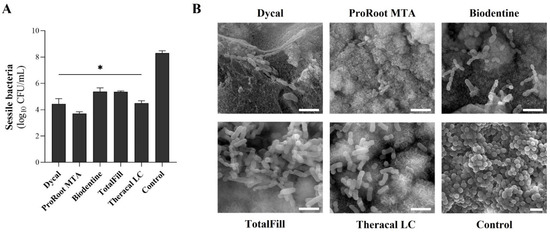 (A) Viable counts of the sessile S. mutans population after a 24 h direct incubation with the set CSCs, expressed as mean Log10 CFU/mL. (B) SEM images of S. mutans morphology on the surface of the materials (scale bar 2 µm). * Statistically significant difference from the control, p ≤ 0.05.