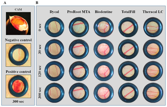 In vivo HET-CAM irritation assay. (A) Representative images of CAM and the negative and positive controls after exposures of 300 s. (B) Representative CAM images after exposure to the undiluted cement extracts for periods up to 300 s. Microscopic images were taken at 10× magnification.