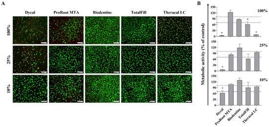 (A) Live/dead assay fluorescence images of L929 fibroblasts exposed to 100%, 25%, and 10% cement extracts for 24 h; live cells (green) and dead cells (red) (scale bar 200 μm). (B) Metabolic activity measured in the same cultures, expressed at percentage of control, set at 100% (dotted line); the “cut-off” value of 70% of the control is also shown (dashed line). * Statistically significant difference from the control, p ≤ 0.05.
