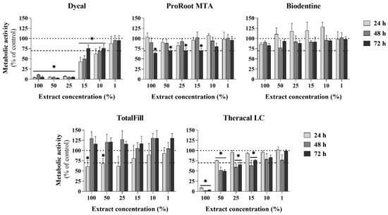 With the Biodentine extracts, the cell growth was not affected, and, further, increased values were observed upon exposure for 24 h for the 50–10% extracts (though without significant differences).