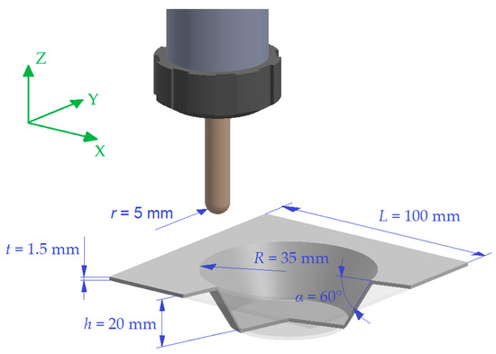 The numerical model was constituted by the sheet, a square with a side L = 100 mm (equal to the internal area of the clamping frame) and thickness equal to t = 1.5 mm, and the hemispherical head of the tool (the part in contact with the sheet; radius r = 5 mm).