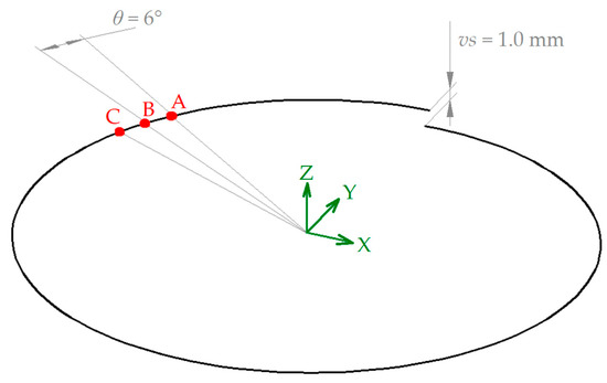Five different toolpath strategies were considered in this study. The reference toolpath involved the contact of the tool with the sheet on points of a spiral path; with this solution, the tool follows a continuous path along X, Y, and Z axes, outlining the shape of the geometry and avoiding line scarring caused by step downs, typical of a Z-level contouring toolpath [37]. The spiral was described with a vertical distance between two successive spirals equal to vs = 1.0 mm; the points along the spiral were angularly spaced around θ = 6° from each other. The schematization in Figure 2, limited to one spiral, reports the characteristics of this path; in detail, it reports vs and θ, while three consecutive points are labelled with A to C.