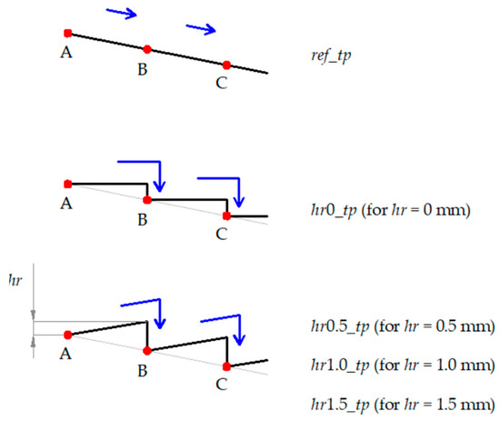 As anticipated above, four other strategies were considered to link two consecutive points; the first one was a stair path (involving an alternation of horizontal and vertical down steps), while the other three alternated between diagonal up and vertical down steps. For these four cases, the ramp height of the first step, hr, was equal to 0 (stair path), 0.5, 1.0, and 1.5 mm. Figure 3 summarizes, in a not-to-scale representation, the planar development of the five toolpath strategies; they are labeled ref_tp (reference toolpath) and hr0_tp, hr0.5_tp, hr1.0_tp, and hr1.5_tp, as a function of hr.