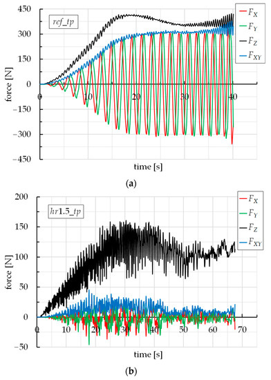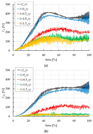 The forming forces were collected by the most common contact-related output file, RCFORC. It is an ASCII file containing resultant contact forces, written in the global coordinate system, for the slave and master sides of each contact interface. Figure 4 reports the trend of the forming forces vs. time for the two limit cases, i.e., the ref_tp (Figure 4a) and the hr1.5_tp (Figure 4b). Note that FX, FY, and FZ were directly obtained from the RCFORC file, while the module of the force acting in the sheet plane, FXY, was the combination of FX and FY: