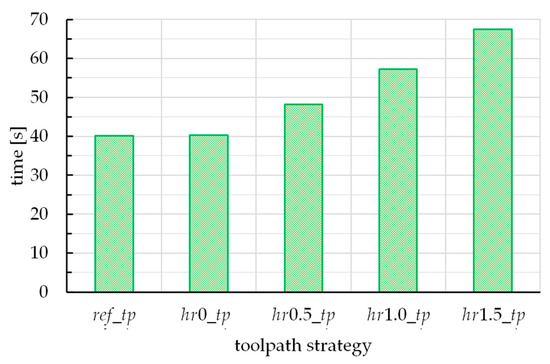 Concerning the forming time (see Figure 6), it increases, passing from the ref_tp to hr1.5_tp case. This is a direct consequence of the increase of length of the toolpath; the first strategy represents the shortest one, to cover with discrete points a spiral, while the other ones gradually diverge from this condition.