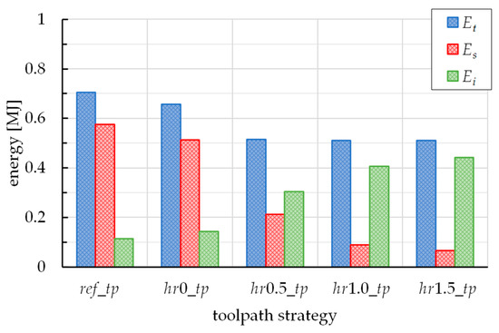 Finally, Figure 7 reports three forms of energy vs. the toolpath strategy. In detail, they are the total energy, Et, the sliding energy, Es, and the internal energy, Ei. They were collected by the ASCII file named GLSTAT.