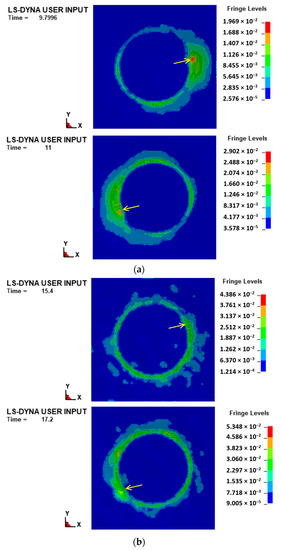 From the figure, it is possible to note that the ref_tp strategy (Figure 8a) determines strain accumulation on a large area of the sheet and its distribution is asymmetric, following the advancement of the tool (whose current position is indicated with an arrow); these phenomena are not so noticeable for the hr1.5_tp strategy (Figure 8b), and this translates into a more localized deformation and reduced distortion of the shells subject to the forming action of the tool.