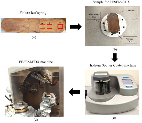 Fracture identification in FESEM-EDX test for (a) Failure leaf spring; (b) Sample for FESEM-EDX; (c) Iridium Sputter Coater machine; (d) FESEM-EDX machine.