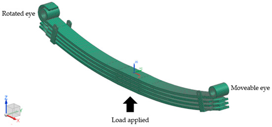 FEA was performed on the leaf spring geometry to identify the critical location of the strain gauge. Three-dimensional (3D) isoparametric tetrahedron elements attained 51,377 nodes and 100,725 elements in a 10 mm mesh on the leaf spring geometry model, and mesh convergence was conducted to obtain reliable results using SimcenterTM 3D software (Figure 3). For boundary conditions, one eye of the leaf spring was secured to act as a rigid shackle with a rotating movement, as shown in Figure 3. Meanwhile, the other eye was set as a moveable shackle in the x-axis direction. The load was applied at the middle of the leaf spring in an upward vertical movement. The total mass weight of a bus, including a full load of passengers, is 14,200 kg. A quarter of the total mass weight is used as the consideration to calculate the deformation and von Mises stress. Thus, the applied load is set to 34.815 kN per leaf spring for static analysis purposes. SAE5160 carbon steel, a commonly used material for leaf springs, was used as the boundary condition. The mechanical properties of the applied SAE5160 carbon steel are as follows [38]: ultimate tensile strength (Su) of 1584 MPa, yield strength (Sy) of 1487 MPa, modulus of elasticity (E) of 207 GPa, density at a range of 7.7–8.03 × 103 kg/m3 and Poisson’s ratio of 0.27. Cyclic properties of the applied SAE5160 carbon steel are as follows: fatigue strength coefficient (σ’f) of 2063 MPa, fatigue strength exponent (b) of −0.08, fatigue ductility exponent (c) of −1.05, fatigue ductility coefficient (ɛ’f) of 9.56 MPa, cyclic strain hardening exponent of 0.05 and cyclic strength coefficient of 1940 MPa. Figure 3 illustrates the FE model of the leaf spring.