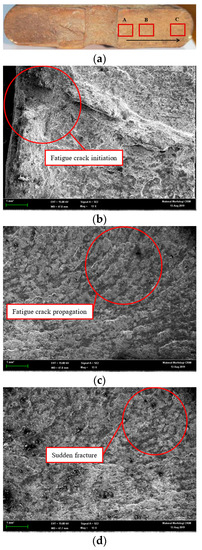 Fractography of the leaf spring: (a) Crack region; (b) Fatigue crack initiation at region A; (c) Fatigue crack propagation at region B; (d) Sudden fracture at region C.
