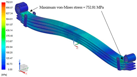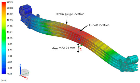 FEA was used to obtain the critical hotspot on the leaf spring. A vehicle load of 34.814 kN was applied using the FE model, with the total vehicle mass divided by four to mimic the applied load for each leaf spring. Figure 6 shows the critical hotspot region with a maximum deformation at 22.74 mm. This result is consistent with the FE model in Figure 6, where the critical region is at the U-bolt area, which is located on a red contour, as the effects of shear stresses on the leaf spring subsurface are due to cyclic loading [57]. The maximum critical region based on the von Mises stress shown in Figure 7 is determined as the location where the strain gauge is attached in the U-bolt area with space constraints. The maximum von Mises stress of 752.81 MPa is still lower than the ultimate tensile strength of 1584 MPa. Thus, this analysis can successfully identify the critical region.