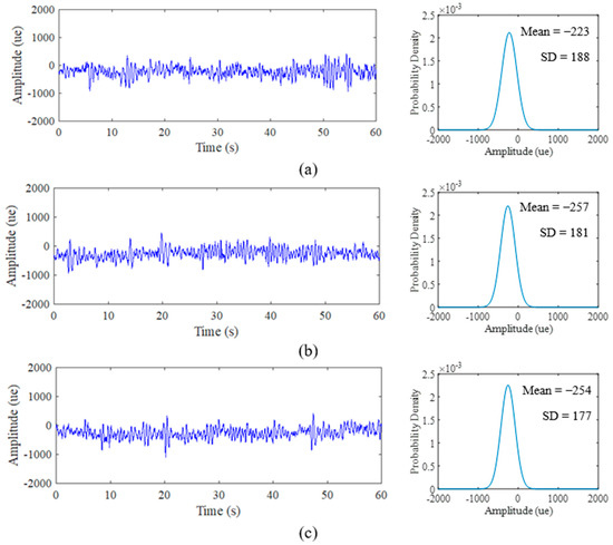 Time history road load obtained from experimental and PDF of: (a) Campus Day 1; (b) Campus Day 2; (c) Campus Day 3.
