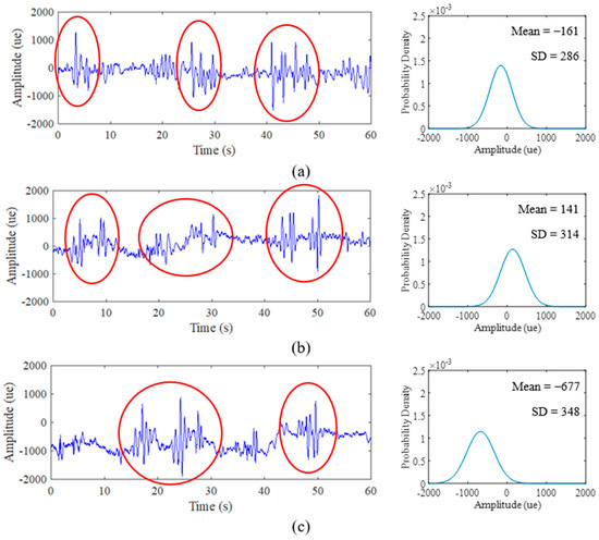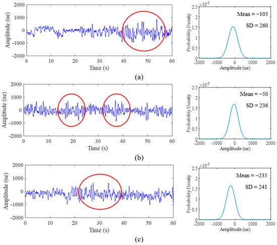 Various strain data extracted for the duration of 60 s at a 500 Hz sampling rate resulted in 30,000 discrete data points. In order to collect a sufficient amount of information from strain data, 500 Hz is enough to be set for road test purposes [40]. Figure 8, Figure 9 and Figure 10 display the time history and PDF of the highway, rural and campus roads, respectively, with each road type exhibiting three different sets of data collection. The unit of collected data is the microstrain (µɛ). The comparison between road types shows that several amplitude peaks of campus data are higher than those of rural and highway data, as highlighted by the red circles in Figure 9 and Figure 10. Campus data also exhibit several high amplitude events compared with rural data due to braking activity at humps found along the campus road.