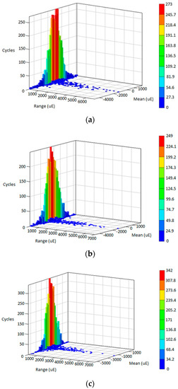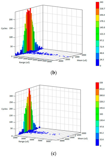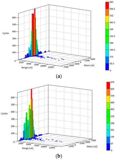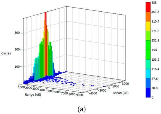 The fatigue life is predicted in the time domain for every cycle by reversing the linear fatigue damage model in Equation (1) using the rainflow cycle count approach. Figure 11, Figure 12 and Figure 13 illustrate the rainflow cycle count for highway, rural and campus data, respectively. The histogram shows that highway data demonstrate the lowest maximum cycles compared with rural and highway data. The blue scatters in highway data show the minimum cycle at a lower range, whereas campus data exhibit the minimum cycle scattering at a higher range. This finding is related to random strain loads contained in the data influenced by the irregular road profiles. Hence, the strain load data of the leaf spring are scattered in the negative mean region where tension and compression conditions are described within the in-service life.