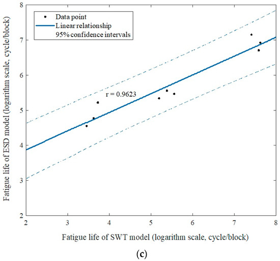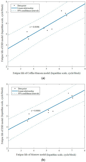 In order to investigate the linearity of fatigue life data, the linear relationship of the Pearson correlation is used to correlate the ESD model with the established strain–life model. Figure 14 illustrates the Pearson correlation between the models of ESD versus Coffin–Manson, Morrow and SWT, respectively. The result shows the fatigue life data is within a 95% confidence interval. Additionally, the coefficient of Pearson correlation is calculated and obtained: the coefficient values, r, for Coffin–Manson, Morrow and SWT models are 0.9091, 0.9396 and 0.9623, respectively. These values indicate that the fatigue life data is significantly linear correlated, as the coefficient values exceed 0.9. A value greater than 0.8 is considered to represent good correlated data [43]. As a result, the ESD model is applicable to be used in predicting fatigue life.