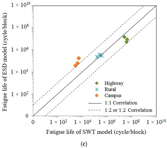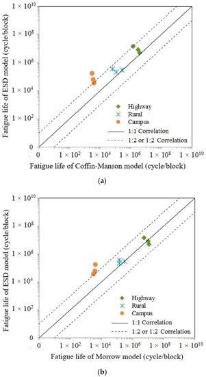 Figure 15 demonstrates the correlation based on a 1:2 or 2:1 fatigue correlation curve amongst the strain–life models of Coffin–Manson, Morrow and SWT with the ESD model. Campus data lying outside the 1:2 or 2:1 boundary line is likely due to several high amplitude ranges because of bumps and potholes. The prediction of fatigue life demonstrates a high correlation when fatigue life data lie within the 1:2 and 2:1 boundary line [43]. The ESD correlation between the Morrow and SWT models is superior to that of the Coffin–Manson model because several data lie outside the boundary lines. The Morrow and ESD correlation within fatigue life boundary conditions of 1:2 and 2:1 indicate the survivability of the predicted fatigue life values that can be used in fatigue reliability. The R2 value of Coffin–Manson versus ESD is 0.5661, while that of Morrow and SWT versus the ESD model are 0.6161 and 0.7181, respectively. The R2 values showed that the ESD model obtains the best correlation with the SWT model because it provides the highest R2 value versus those of the Morrow and Coffin–Manson models. Hence, the ESD model is proposed as it has nearly the same characteristics as SWT based on the presence of tension and compression during operating conditions.