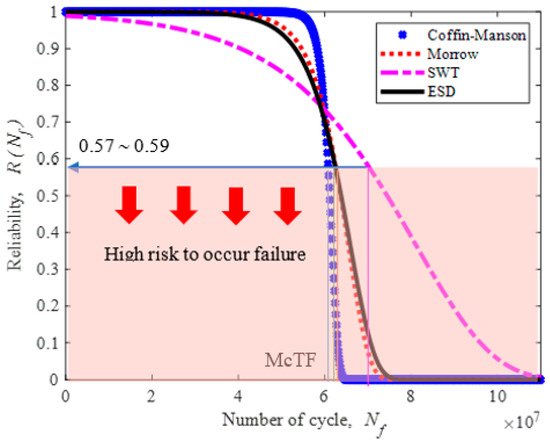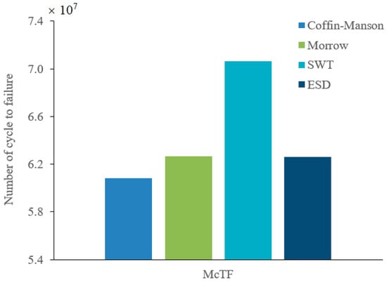 The Gumbel distribution was selected to assess the reliability of the leaf spring according to the normality test for fatigue strain data. Gumbel properties of location and scale parameters were calculated to estimate the mean value based on Equation (11). In reliability assessments, the mean time to failure (MTTF) is referred to as the mean value of Gumbel [21]. Because the fatigue life prediction is calculated subject to the cycles unit, the MTTF is therefore renamed as the mean cycle to failure (McTF) [59]. Figure 16 illustrates the McTF for various strain–life models, including the ESD model. The SWT model obtained the highest McTF value at 7.065 × 107 cycle/block, followed by the Morrow and ESD models at 6.264 × 107 and 6.259 × 107 cycle/block, respectively, while the Coffin–Manson model demonstrated the lowest McTF value of 6.083 × 107 cycle/block.