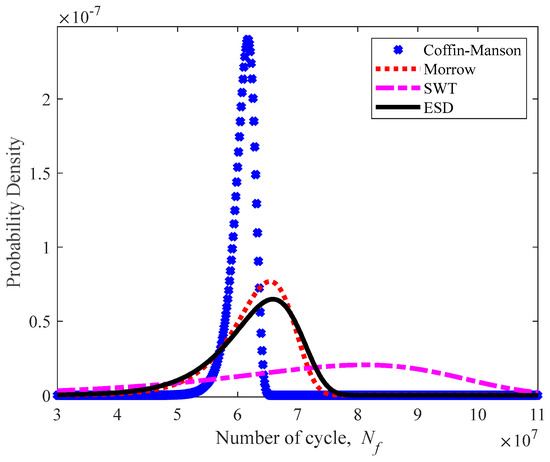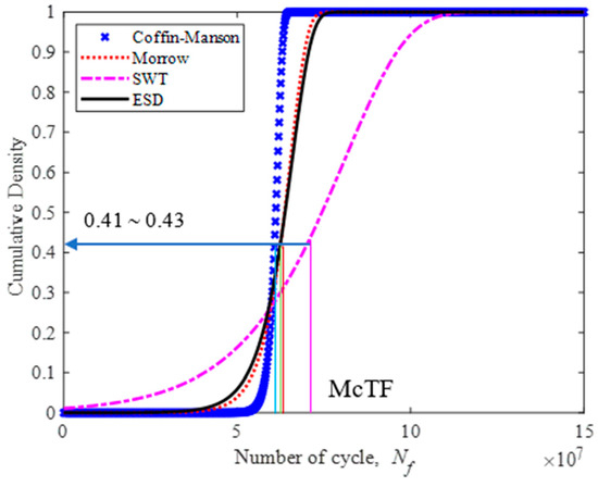Figure 17 shows the PDF plots of durability models, indicating that the Morrow and ESD models are nearly identical. Likewise, the movement of the leaf spring case involves compressions and tensions during its in-service life. Therefore, amongst the strain–life models, Morrow and SWT are considered acceptable in value compared with ESD. This condition was asserted by Kadhim et al. [52], whereby the ESD model displayed a greater accuracy than the Coffin–Manson, Morrow and SWT models when incorporated into the estimation of fatigue life using numerous load data. The same behaviour was demonstrated by the CDF plot in Figure 18; the Morrow and ESD models describe a near-identical probability of failure within the range of 0.41 to 0.43.