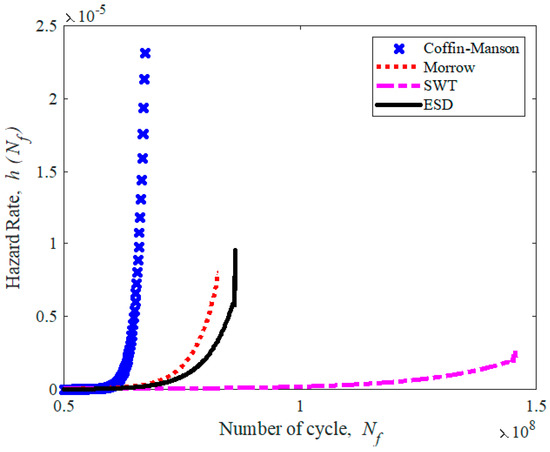 The reliability of the fatigue lives data is within a range of 0.57 to 0.59. Therefore, the leaf spring would experience a high risk of failure when the reliability rate is below 0.59, as shown in Figure 19. The hazard rate of a leaf spring is illustrated in Figure 20. It shows a rapidly increasing hazard rate in the Coffin–Manson model until 6.72 × 107 cycles/block at a rate of 2.3 × 10−5, followed by the increase in the Morrow and ESD models until 8.27 × 107 and 9.5 × 10−6 cycles/block at a rate of 8.0 × 10−6 and 8.63 × 107, respectively. The SWT model slowly increases at the maximum life of 1.46 × 108 cycles/block at a rate of 2.8 × 10−6. Hence, this indicates that the leaf spring begins to deteriorate when the reliability value starts to fall below 0.59.