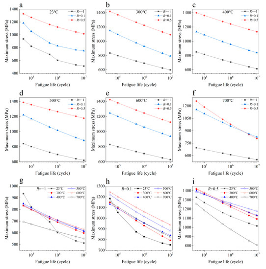 S-N data of nickel-based superalloy at different temperatures and stress ratios: (a–f) Different stress ratios at 23 °C, 300 °C, 400 °C, 500 °C, 600 °C, 700 °C, respectively; (g–i) Different temperatures at R = −1, R = 0.1 and R = 0.5, respectively.