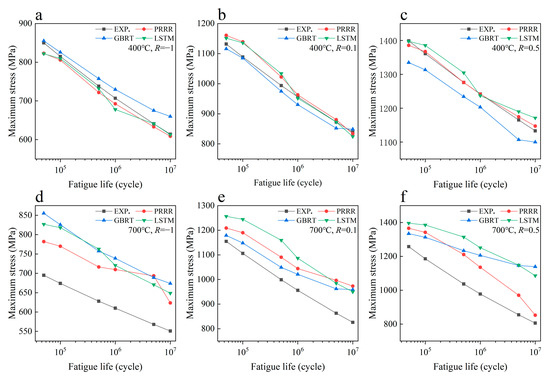 Predicted results of different machine learning models for the fatigue strength of the nickel-based superalloy under different conditions in case 1: (a) 400 °C, R = −1; (b) 400 °C, R = 0.1; (c) 400 °C, R = 0.5; (d) 700 °C, R = −1; (e) 700 °C, R = 0.1; (f) 700 °C, R = 0.5. (EXP. represents the experimental data).