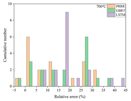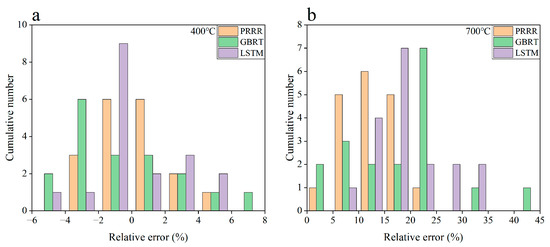 Relative errors of the predicted results to the experimental data for the different machine learning models in Figure 3: (a) 400 °C; (b) 700 °C. The range of relative errors is the same between the same numbers on the horizontal axis.