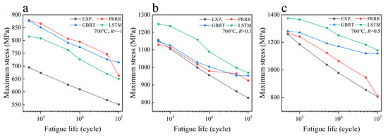 Predicted results of different machine learning models for the fatigue strength of the nickel-based superalloy in case 2: (a) 700 °C, R = −1; (b) 700 °C, R = 0.1; (c) 700 °C, R = 0.5.