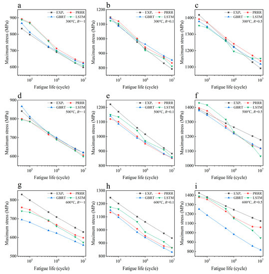 Predicted results of different machine learning models for the fatigue strength of the nickel-based superalloy under different conditions in case 3: (a) 300 °C, R = −1; (b) 300 °C, R = 0.1; (c) 300 °C, R = 0.5; (d) 500 °C, R = −1; (e) 500 °C, R = 0.1; (f) 500 °C, R = 0.5; (g) 600 °C, R = −1; (h) 600 °C, R = 0.1; (i) 600 °C, R = 0.5.