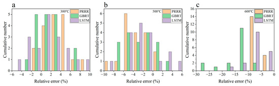 Relative errors of the predicted results to the experimental data for the different machine learning models in Figure 7. (a) 300 °C; (b) 500 °C; (c) 600 °C. The range of relative errors is the same between the same numbers on the horizontal axis.