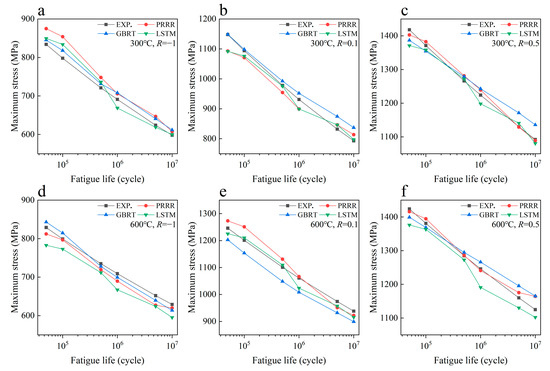 Predicted results of different machine learning models for the fatigue strength of the nickel-based superalloy under different conditions in case 4: (a) 300 °C, R = −1; (b) 300 °C, R = 0.1; (c) 300 °C, R = 0.5; (d) 600 °C, R = −1; (e) 600 °C, R = 0.1; (f) 600 °C, R = 0.5.