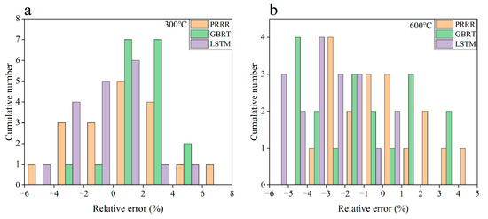 Relative errors of the predicted results to the experimental data for the different machine learning models in Figure 9. (a) 300 °C; (b) 600 °C. The range of relative errors is the same between the same numbers on the horizontal axis.