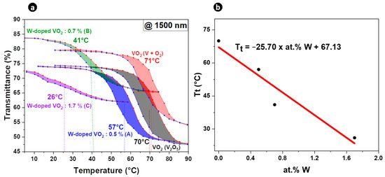 - Jin, P.; Nakao, S.; Tanemura, S. Tungsten Doping into Vanadium Dioxide Thermochromic Films by High-Energy Ion Implantation and Thermal Annealing. Thin Solid Film. 1998, 324, 151–158. [Google Scholar] [CrossRef]