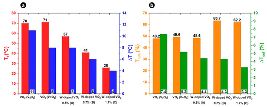 - Pan, G.; Yin, J.; Ji, K.; Li, X.; Cheng, X.; Jin, H.; Liu, J. Synthesis and Thermochromic Property Studies on W Doped VO2 Films Fabricated by Sol-Gel Method. Sci. Rep. 2017, 7, 6132. [Google Scholar] [CrossRef] [PubMed]