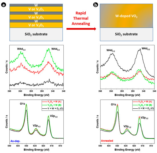 - Chen, S.-E.; Lu, H.-H.; Brahma, S.; Huang, J.-L. Effects of Annealing on Thermochromic Properties of W-Doped Vanadium Dioxide Thin Films Deposited by Electron Beam Evaporation. Thin Solid Film. 2017, 644, 52–56. [Google Scholar] [CrossRef]